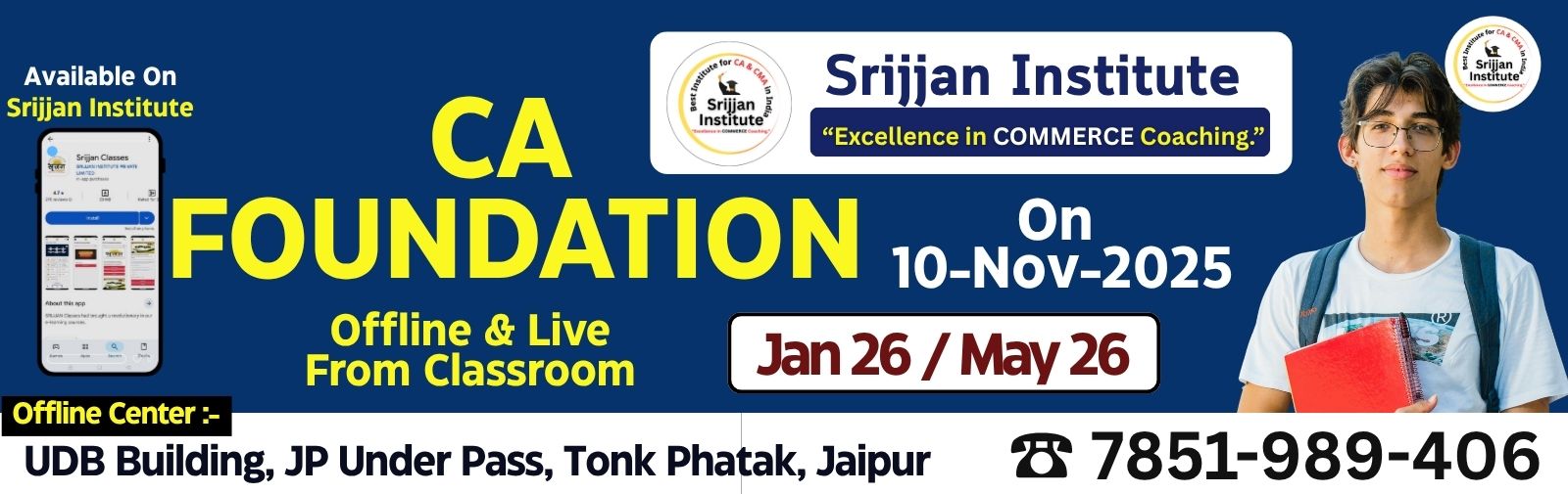 Established in 2011 by Manish Chaklan Sir, with 25 years of experience in commerce and government education, Srijjan Institute Jaipur is the premier institute in Rajasthan for CA Foundation, CMA Foundation, RPSC 1st Grade Commerce, RSMSSB Junior Accountant, NTA/UGC NET Commerce, Rajasthan CET, and ASO exams.